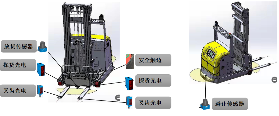 4. 安全性能:具備激光避讓(區域安全激光);碰撞條檢測(車頭半包圍碰撞條檢測);托盤到位檢測;叉齒檢測(叉齒紅外傳感器檢測);急停按鈕(左右急停按鈕);聲光報警;貨物檢測。